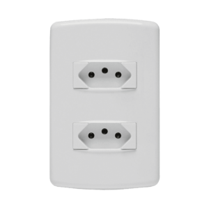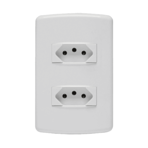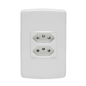 Conjunto Tomada 2P+T Duplex. Segurança: atende o novo padrão brasileiro que evita choques e inserções parciais. Atende as diretivas ROHs. Design inovador, fácil de instalar e limpar, com superfície em extra brilho. Agilidade na obra, com instalação até 70