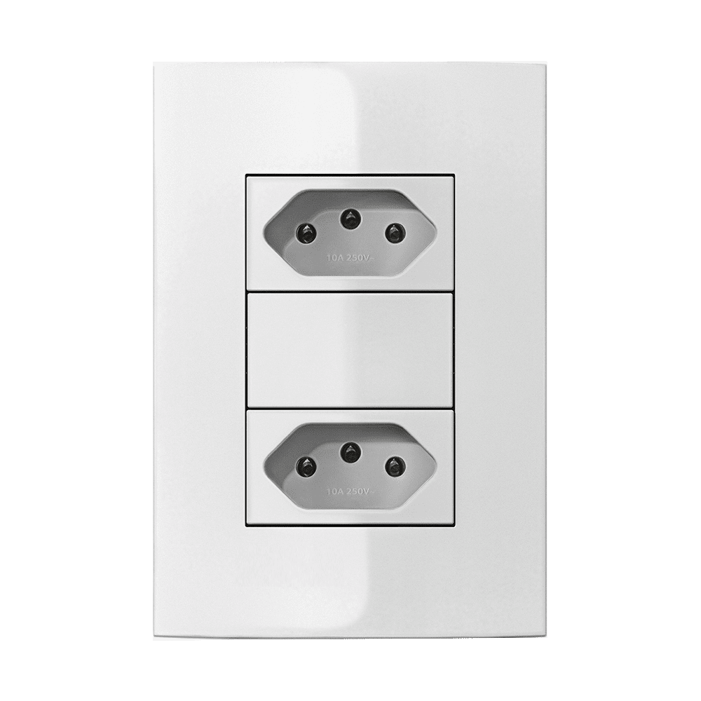 Conjunto 2 Tomadas 2P+T. Segurança: atende o novo padrão brasileiro que evita choques e inserções parciais. Atende as diretivas ROHs. Requinte e estilo! Disponível na cor branco. Corrente de 10A e tensão 250V. Produzido em material termorplástico de alta