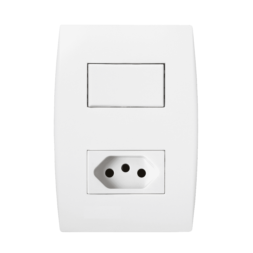 Conjunto Interruptor Simples + Tomada 2P+T 20A IRIEL. Segurança: atende o novo padrão brasileiro que evita choques e inserções parciais. Atende as diretivas ROHs. D Design clássico e clean que combinam com o seu estilo. Perfil mais fino com ausência de pa