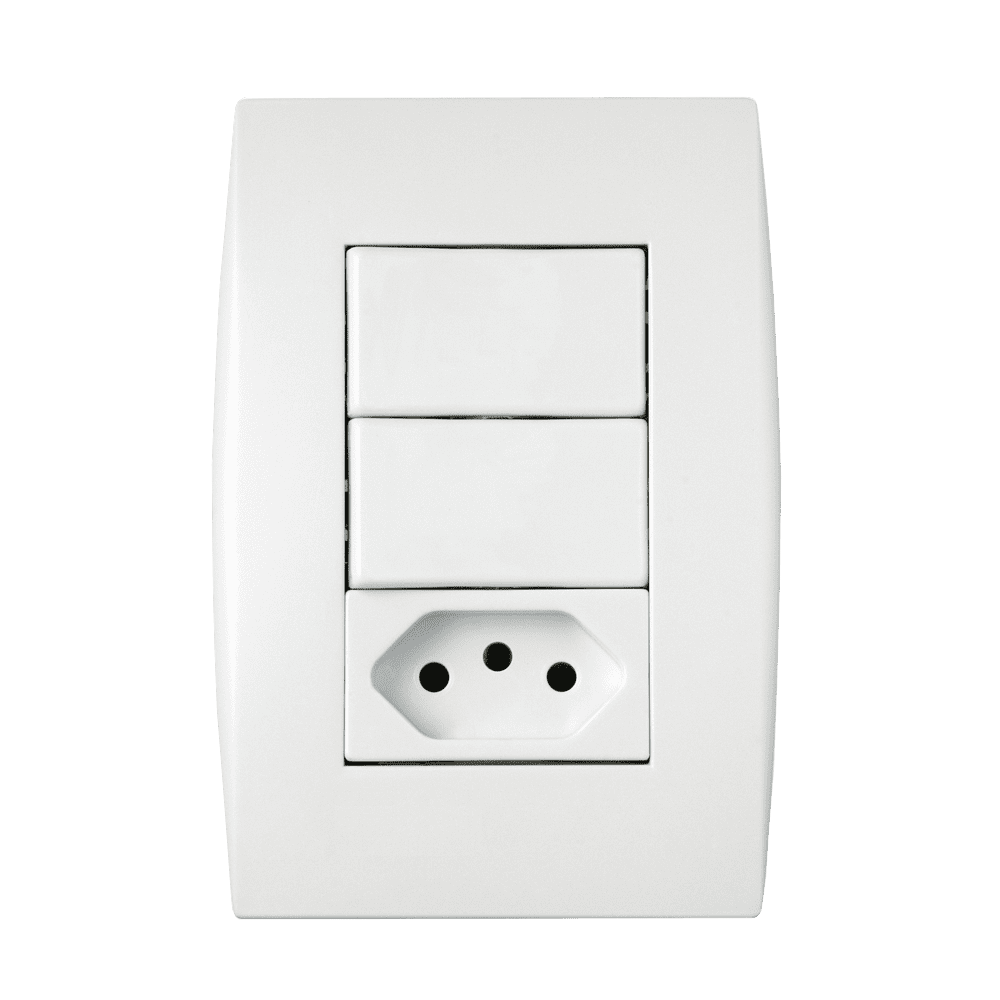 Conjunto 2 Interruptores Simples + Tomada 2P+T IRIEL. Segurança: atende o novo padrão brasileiro que evita choques e inserções parciais. Atende as diretivas ROHs. Design clássico e clean que combinam com o seu estilo. Perfil mais fino com ausência de par
