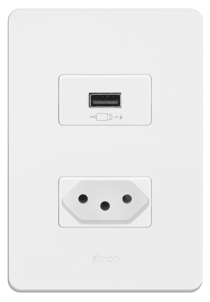 CONJUNTO CARREGADOR USB 2.1A TURBO CHARGE + TOMADA 2P+T 10A 250V C/PLACA + SUPORTE – SIMON 20