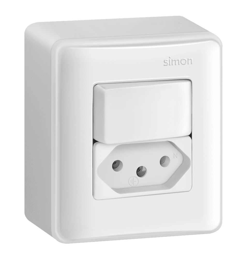 CONJUNTO DE SOBREPOR 1 INTERRUPTOR SIMPLES 10A 250V + 1 TOMADA 2P+T PADRÃO BRASILEIRO 10A 250V – BRANCO – SIMON 19