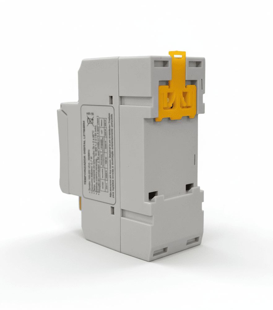 - Encaixe o timer no trilho DIN 35mm (2 módulos – clique duplo).