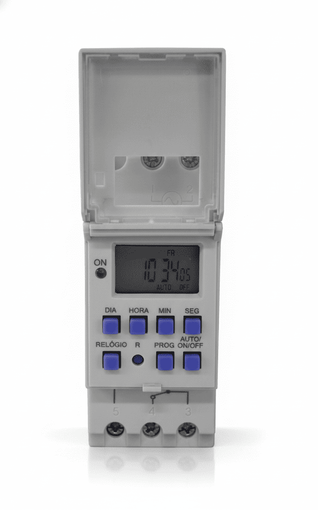 Automatize circuitos com precisão profissional usando o Interruptor Temporizado Digital Trilho DIN 16A 1seg 40 Programas Bivolt Exatron. Instalação em quadro de distribuição, 40 memórias com resolução de 1 segundo, bivolt automático e relé 16A — ideal para iluminação pública, bombas, ventilação, aquecimento e automação predial com controle total e segurança.