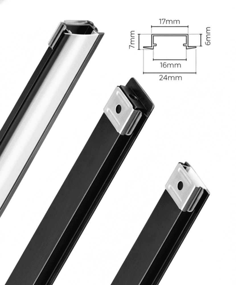 Transforme seus ambientes com o Perfil Embutir Alumínio 24x7mm 3m Preto Fosco PAE3247P Lumanti. Sua qualidade superior, segurança e design moderno garantem uma iluminação elegante e durável, perfeita para qualquer projeto.